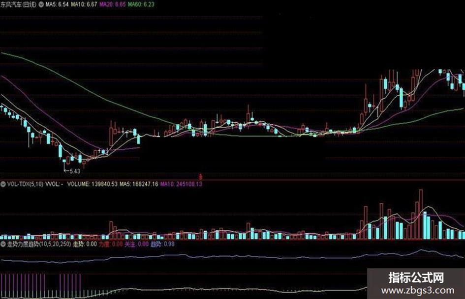 走势: EMA(CLOSE,7)-EMA(CLOSE,20),COLORYELLOW; 力度: EMA(走势,7), COLORSTICK,COLORRED; VAR1:=CLOSE/REF(LLV(LOW,35),5)< 1; 关注: IF(VAR1,0.5,0), STICK,COLORFF00FF; 趋势: EMA(CLOSE/REF(HHV(CLOSE,7),20),1),COLORFF937F,LINETHICK1 ;