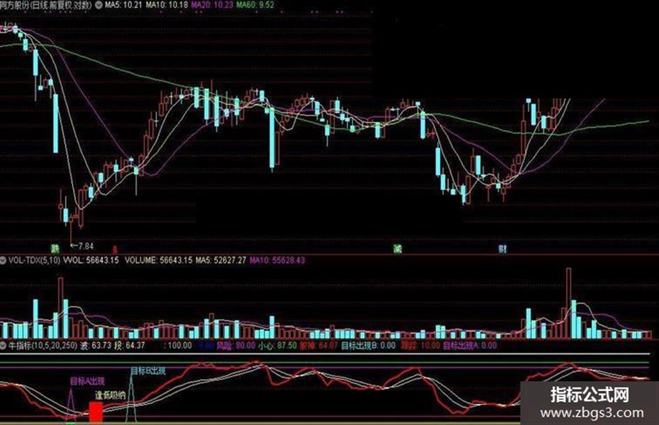 目标出现A:IF((COUNT((股神>REF(股神,1)),1)=1) AND (REF(股神,1)<REF(REF(股神,1),1)) AND (股神<跟踪),50,0),COLORF00FF0;
