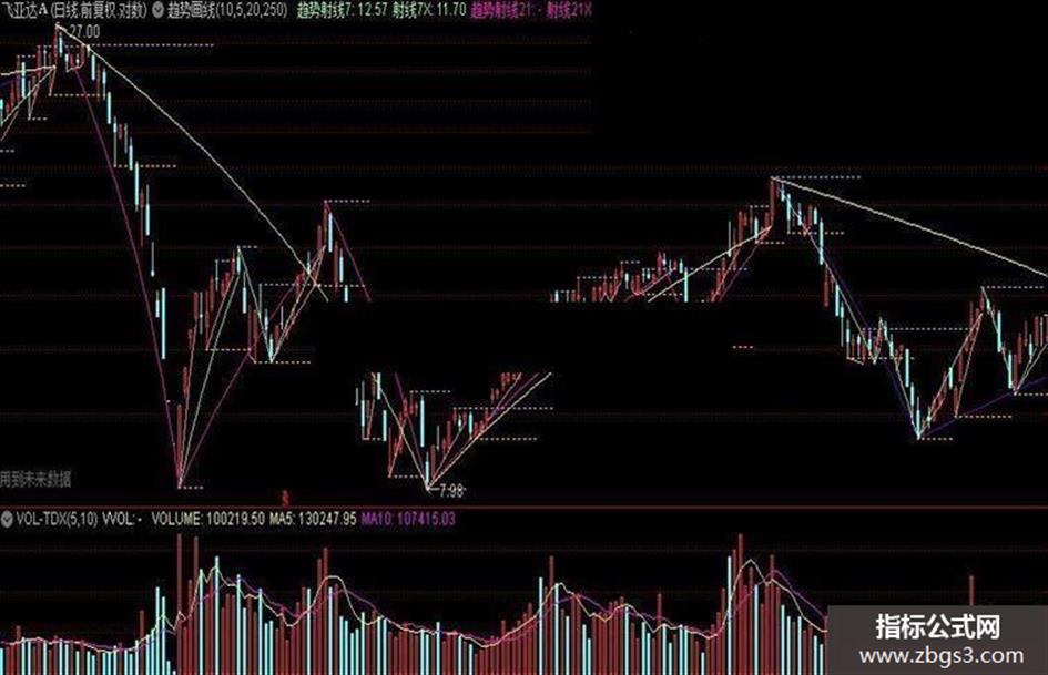 趋势射线7: DRAWLINE(H=HHV(H,7),H,L=LLV(L,7),L,0),COLOR9AFF89;