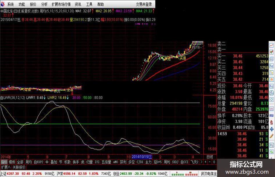用法说明: 80为弱势,50为转强,20为超强。 先看周K,LWR1在80以上(或是上下)下穿LWR2,为上升趋势形成并确认。 LWR双双下穿50,转强。 LWR双双下穿20,(或20以下反复金叉死叉)为超强。 日K图同理,只是把指标参数改为:36, 12, 12。即可