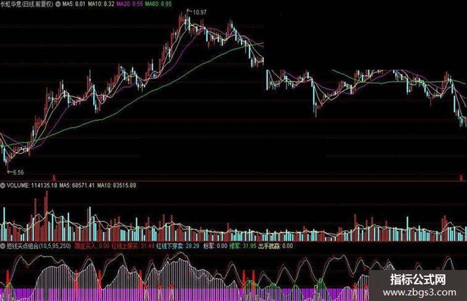 红线上穿买:EMA((VA-VB)/(VC-VB)*100,5),COLORRED;