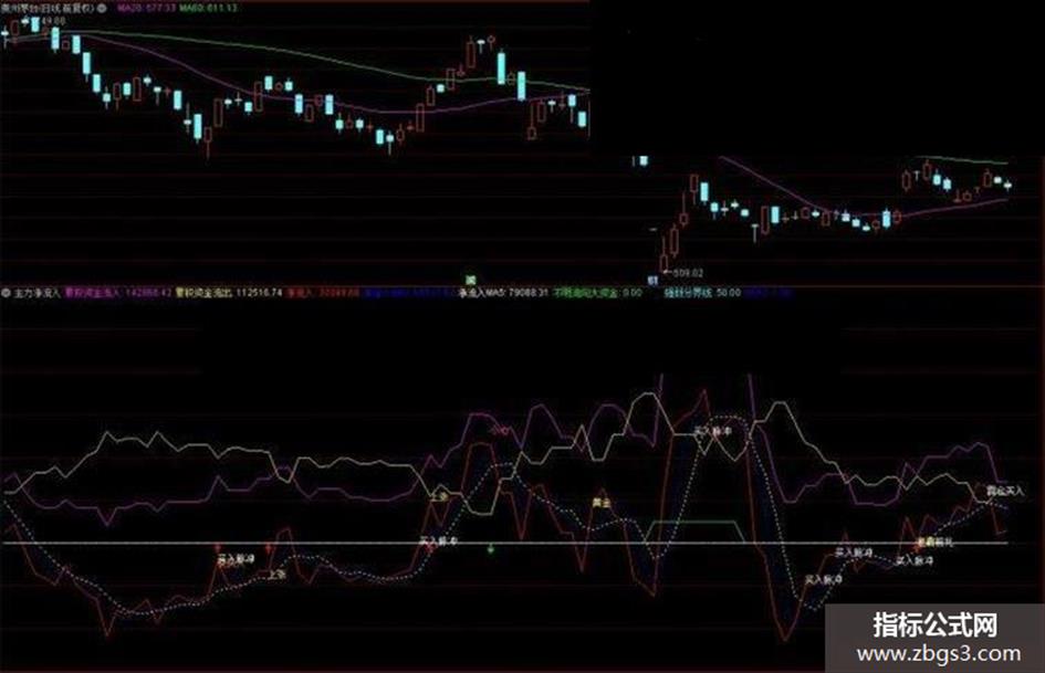 DRAWTEXT(CROSS(主力,散户) AND 主力<35,净流入*0.84,'买入脉冲');