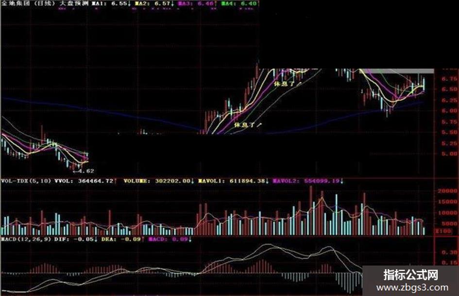 当9日均线上穿14日均线时,在K线最高价上方约2%的位置,绘制一个向上的箭头图标,并显示“大盘”的浅蓝色文字提示。这通常被视为短期看涨信号。