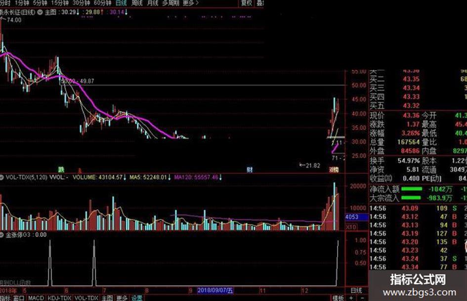 金神通G:REF(HIGH=CLOSE AND (CLOSE/OPEN>1.02 OR (LOW=OPEN AND CLOSE=LOW)) AND CLOSE/REF(CLOSE,1)>1.095 AND REF(CLOSE>=OPEN,1),4) AND REF(REF(CLOSE/REF(CLOSE,1)>1.04 AND X_4 AND X_7 AND CLOSE/OPEN>1.007,2) AND REF(CLOSE>=REF(CLOSE,1) AND CLOSE/OPEN>1.03,1) AND HIGH/CLOSE>1.015 AND CLOSE>=OPEN AND (CLOSE/OPEN<1.007 OR (HIGH/CLOSE>1.04 AND CLOSE/OPEN<1.02)),1) AND OPEN/REF(CLOSE,1)<1.005 AND HIGH/OPEN>1.01 AND HIGH/REF(CLOSE,1)>0.993 AND HIGH/MA(CLOSE,5)>1.005 OR X_43 OR X_44 OR X_45,COLORBLUE,LINETHICK2;