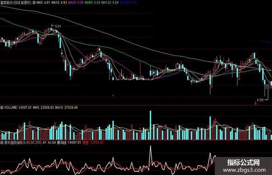 黑马线:EMA(A1,5)/24,LINETHICK2,{COLOR6600FF},COLORWHITE;