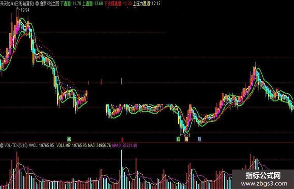 下通道:MA(VAR7,3)*(1-VAR8),LINETHICK2,COLORGREEN;