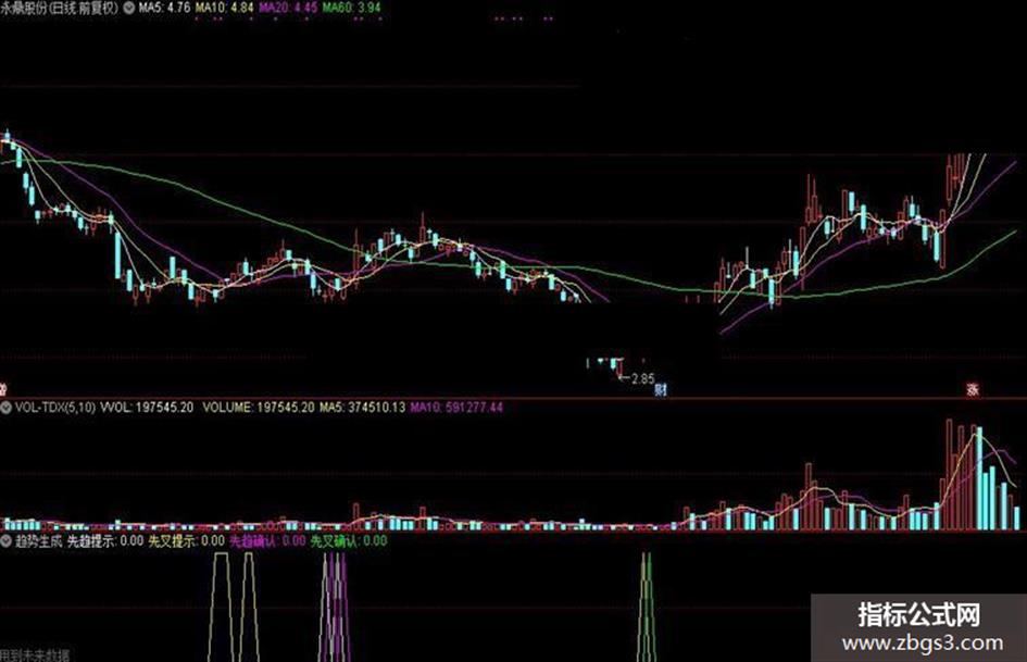 先趋确认:(COUNT(趋势生成,5)=1 AND WR1>趋势线 AND WR1>REF(WR1,1) AND CROSS(SHARP,RSI2));