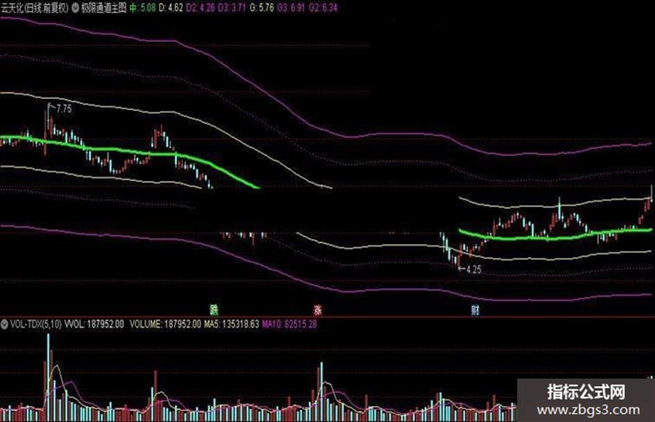 中:MA(L,45),LINETHICK3,COLORGREEN; D:中*0.91,COLORYELLOW; D2:中*0.84,COLORMAGENTA,POINTDOT; D3:中*0.73,COLORMAGENTA; B:=MA(H,45),COLORYELLOW; G:B*1.1,COLORYELLOW; G3:B*1.32,COLORMAGENTA; G2:B*1.21,COLORMAGENTA,POINTDOT;