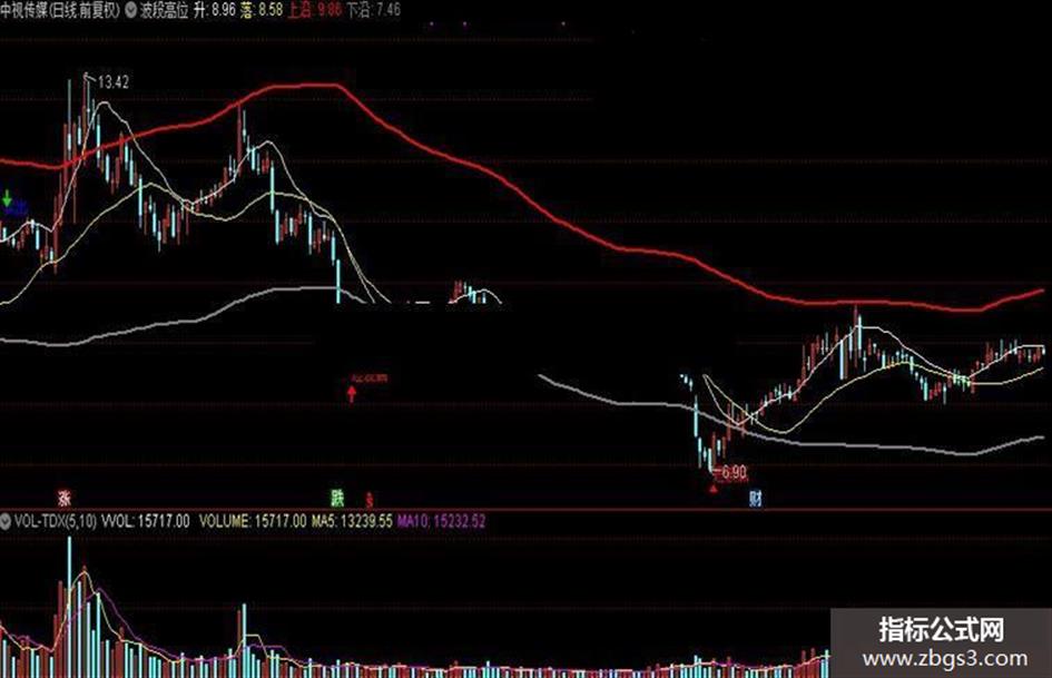 升:MA((((HIGH - LOW) * 0.618) + CLOSE),10);落:MA(LOW,20);