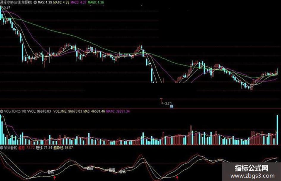 DRAWTEXT(趋势线>REF(趋势线,1)AND REF(趋势线,1)<REF(趋势线,2)AND COUNT(CROSS(超短,短线),3)=1 AND 短线<30,短线,'看底');