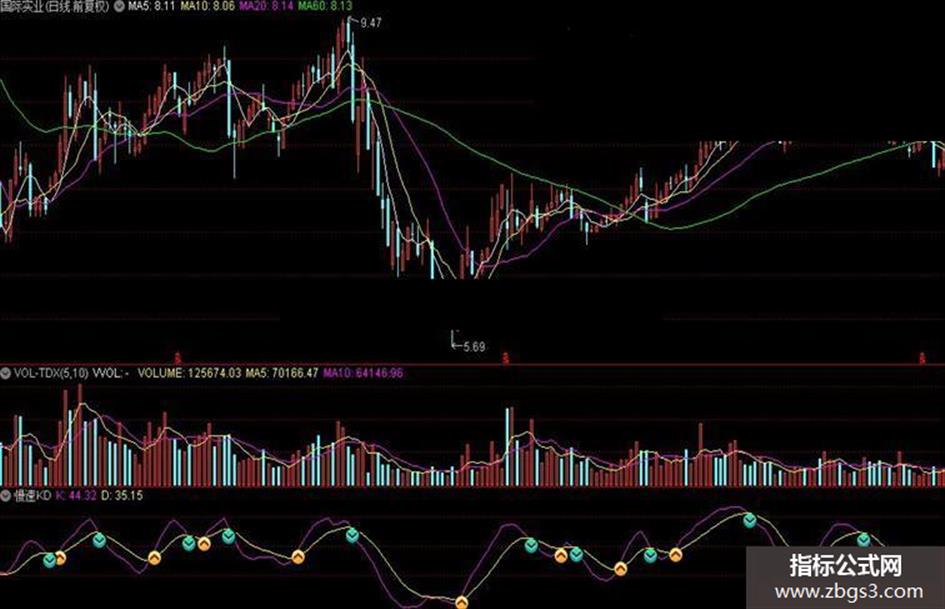N:=9;M:=3;MM:=5; RSV:=(CLOSE-LLV(LOW,N))/(HHV(HIGH,N)-LLV(LOW,N))*100; FASTK:=SMA(RSV,M,1); K:SMA(FASTK,M,1),LINETHICK1,COLORMAGENTA; D:SMA(K,MM,1),LINETHICK1,COLORYELLOW; DRAWICON(CROSS(K,D),K,34); DRAWICON(CROSS(D,K),D,35);