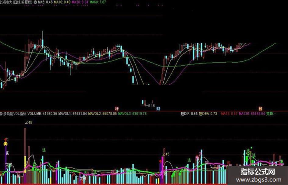 变异:IF(MA(X1,13)>MA(X1,5),MA(VOL,13),DRAWNULL),COLOR00FF00,LINETHICK3;