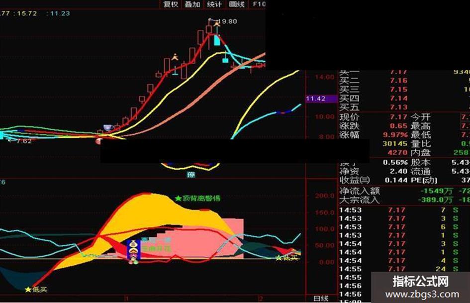 这次经过进一步修改调整,这次把A15D做的更完美。A15D下插线在原基础上不仅做成下插后不仅变红,更重要的是当主图K线在下跌临近坑底时,由蓝色变成红色。当股价拉升接近顶部时,该线由红色变成蓝色。