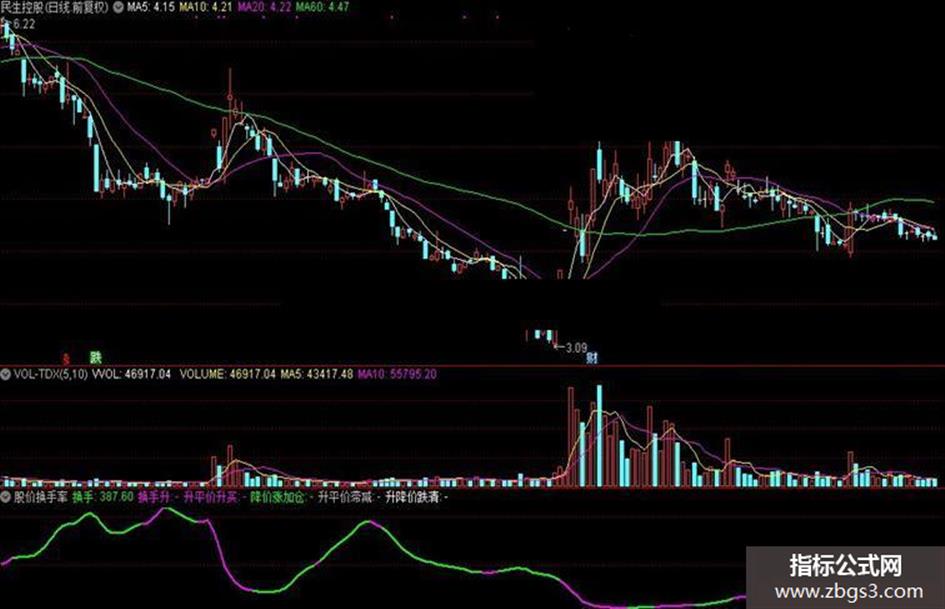 换手升:IF(GJ>=REF(GJ,1),JH,DRAWNULL)LINETHICK2,COLORMAGENTA;
