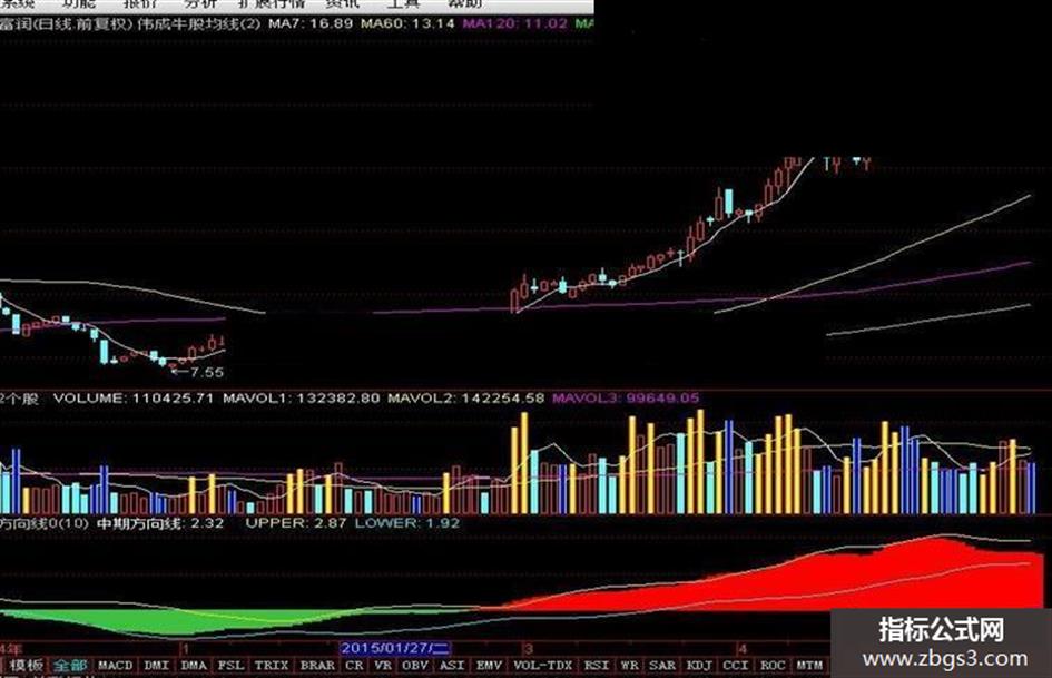 指标应用法则: 红色代表多头,持股;绿色代表空头,持币。 中期方向线经典13中用法(新手老手必学): 1.初学者红做绿不做。 2.0轴之上,黄线下跌,股价反弹。 3.黄线跌破0轴,股价容易变盘。 4.黄线、蓝线压缩,容易变盘。 5.两次翻红容易涨,两次翻绿容易跌。 6.大绿翻红,两到三天有回抽,大红翻绿,两到三天易反弹。 7.红绿相间,能数浪(波浪理论指标的实现)。 8.葛兰威尔的缺陷在中期方向线得到解决。 9.日线周线共振点。 10.红柱脱离黄线容易下跌,绿柱脱开蓝线容易反弹。 11.两个绿柱底部抬高,股价底部降低,容易形成反转。 12.两个红柱降低,股价创新高,也容易反转。 13.黄线、蓝线平行运行,天罗地网不容易三线触顶,考虑其它方法卖出(底也一样)。