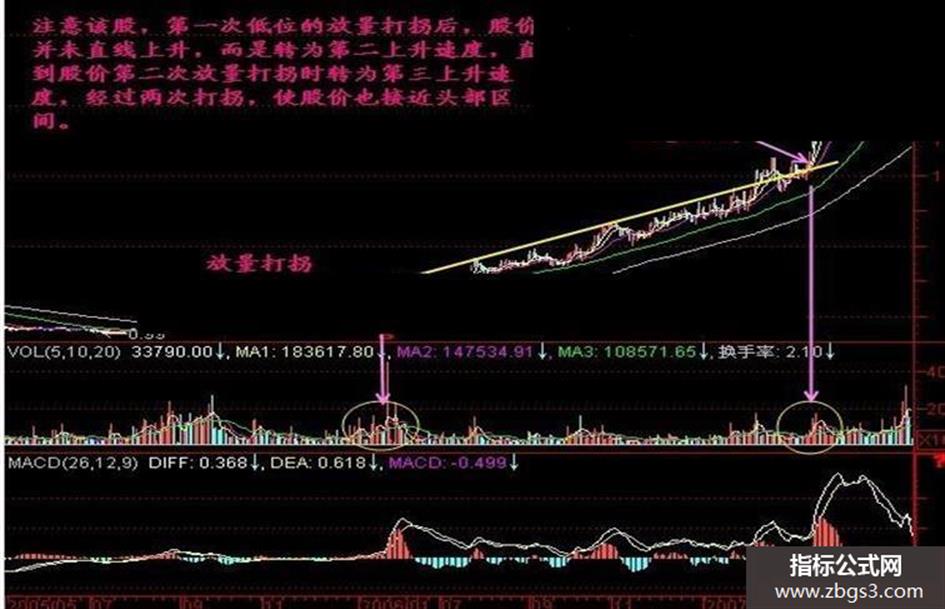 庄家建仓后总要拉升获利,这样才能在高位派发,而在股价建仓区间,往往有一条压力线在上面压制着股价,不让股价超过该压力线,庄家就在压力线之下、60线之上逐步推高股价 在建仓完毕后,可能会洗盘,也可能直接进入拉升,而这条压力线如果被放量突破(或者缩量突破),都意味着庄家已经开始拉升股价了 这就是放量打拐 一旦开始拉升股价,就必须上涨远离成本区,否则庄家没法出货,我们就守候在这根压力线(高点连线)附近,什么时候突破,就什么时候积极跟进