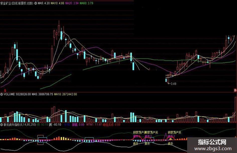 {DRAWTEXT(CROSS(绝佳买点,2.40000) ,-55,'疯牛1'),COLORFFFFCC,LINETHICK3 ; };