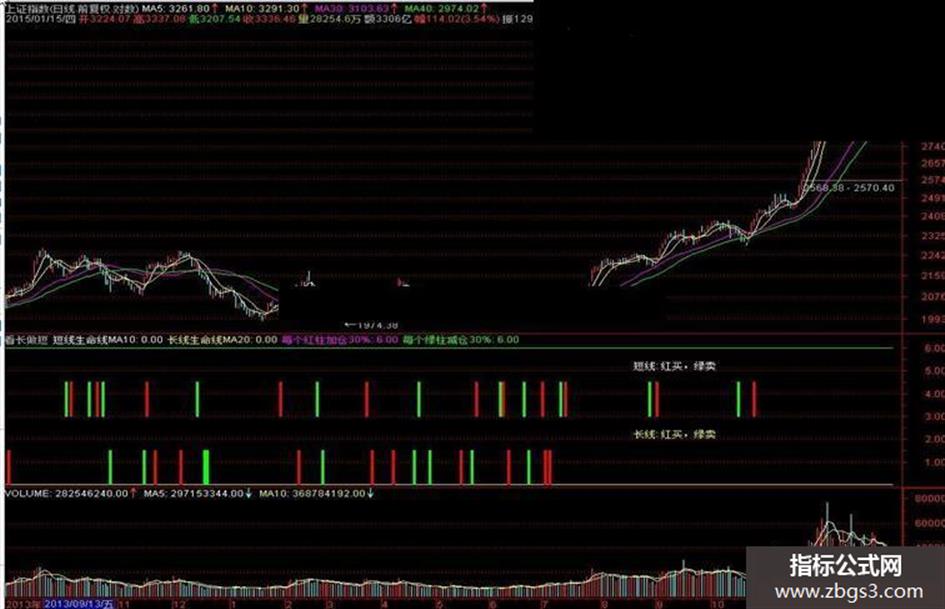 每出现一个绿色柱状线(长线+短线),就卖出1/3仓位,最多连续出现3次。