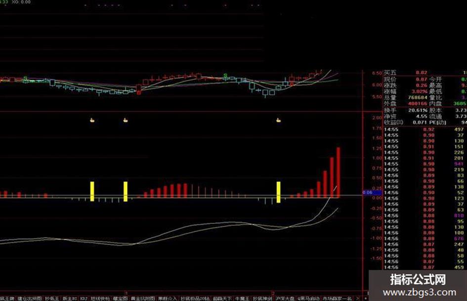 当满足条件启动点时,在0.4和MACD位置之间画柱状线,宽度为2,0不为0则画空心柱.,画黄色