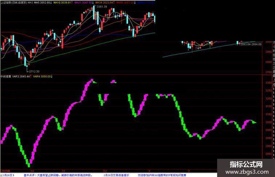 LOCK:=1; VAR1:=MA(CLOSE,1); VAR2:=MA(CLOSE,3); VAR3:MA(VAR2,1)*LOCK; VAR4:MA(VAR2,3)*LOCK; STICKLINE(VAR3>VAR4,VAR3,VAR4*LOCK,4,0),COLORFF00FF; STICKLINE(VAR3<VAR4,VAR3,VAR4*LOCK,3,0),COLOR00FF00;