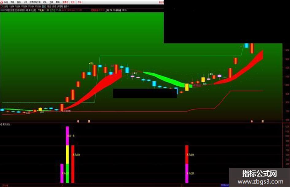 AND (CLOSE > OPEN)) AND (HIGH >= X3)),5),(LOW - 0.03),'←黑马筑底'),COLOR85B256;