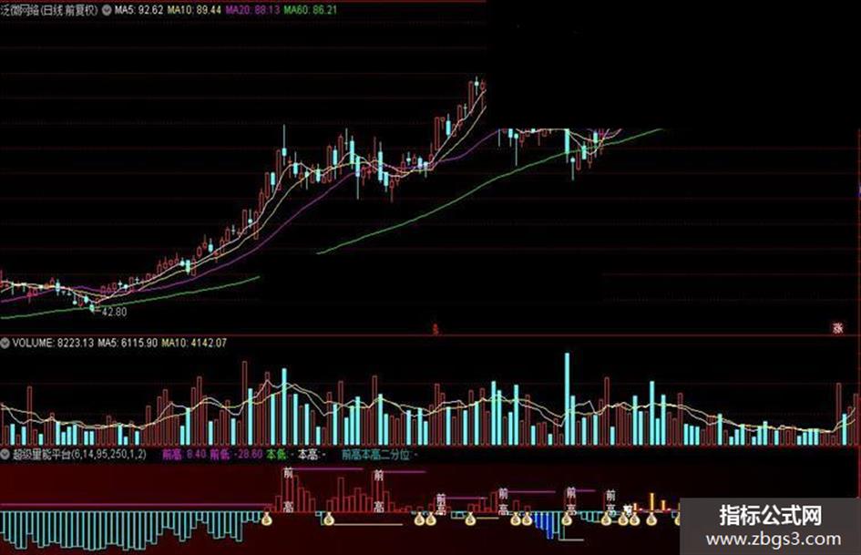 STICKLINE(量能正负>前高 AND 本高>前高 AND BARSLAST(WQG)>0,