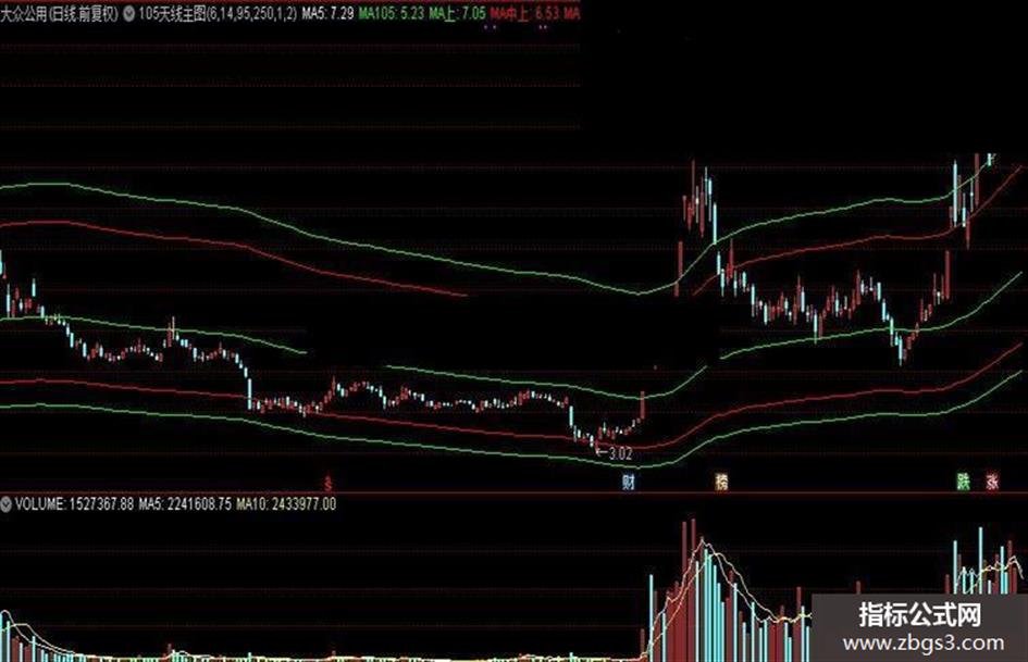 P1:=5; P2:=20; P3:=105; MA5:EXPMA(C,P1),COLORWHITE,NODRAW; {MA20:EXPMA(C,P2),COLORYELLOW;} MA105:EXPMA(C,P3),COLORGREEN; MA上:MA105*1.35,COLORGREEN; MA中上:MA105*1.25,COLORRED; MA中下:MA105/1.2,COLORRED; MA下:MA105/1.3,COLORGREEN;