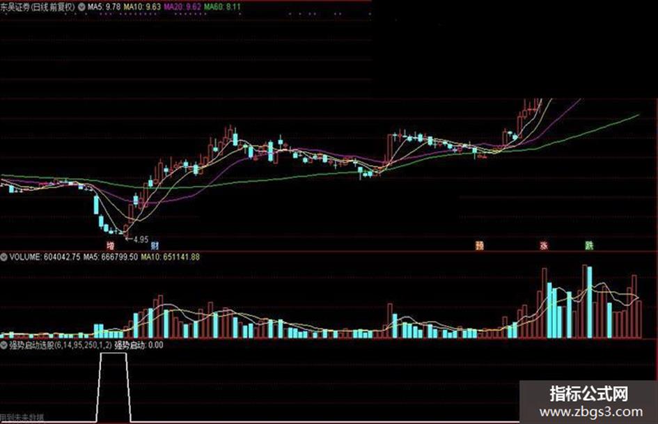 强势启动:IF((REF(SS,2)<REF(SS,1)AND SS>REF(SS,1))*SS>60 AND C<买入*1.06,1.8,0),COLORWHITE,LINETHICK2;