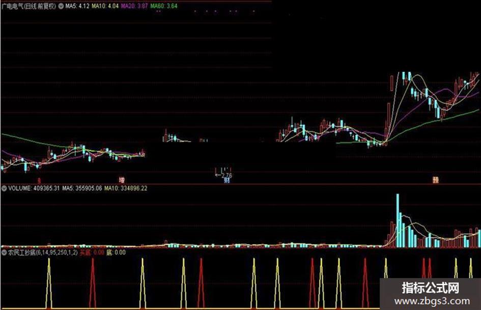 农:="KDJ.J"; 工:="CCI.CCI"; 抄:="BOLL.LB"; B:=MA(C,5); A:=C/抄<=1.0 AND 工<-200 AND 农<0 AND C/B<0.9; 买底:IF(CROSS(农,0),1,0),COLORRED,LINETHICK2; 底:IF(CROSS(工,农),1,0),COLORYELLOW,LINETHICK2;