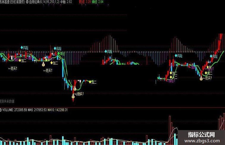 DRAWTEXT(CROSS(MA(C,3),MA(C,9)) AND C>=REF(C,1) AND C>O,L*1.00,'←加仓!'),COLORMAGENTA;