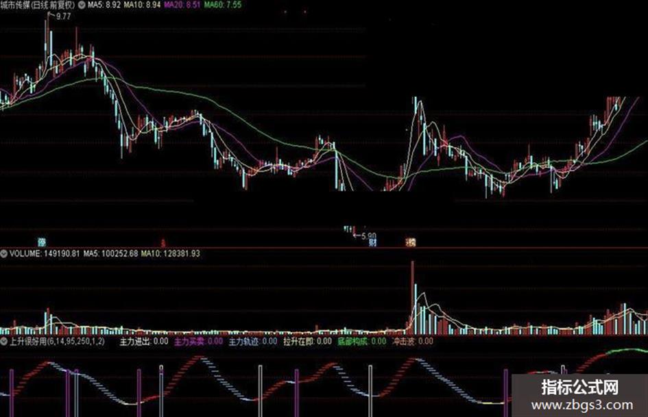 底部构成:IF(V8>=1 AND V9>=1 AND CLOSE>OPEN AND REF(CLOSE,1)>REF(OPEN,1) AND VOL>REF(VOL,1) AND ABV>M2 AND ZLGJ>MAZL,45,0),COLOR00FF00,POINTDOT;
