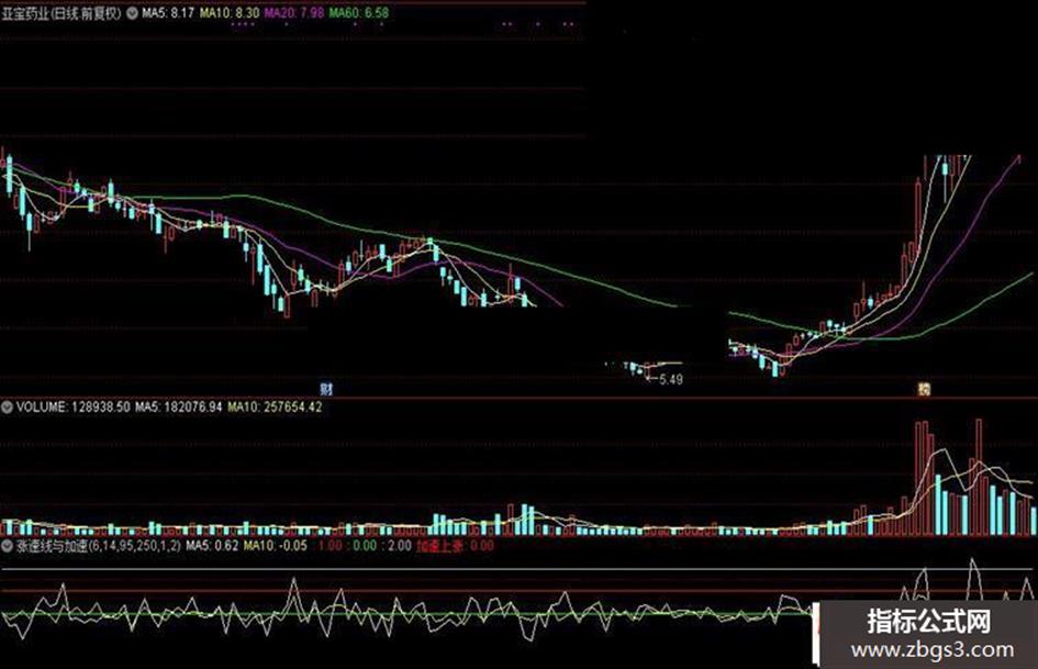 加速上涨:CROSS(MA5,1) AND ( CROSS(MA10,1) OR MA10>=0.98),COLORRED,NODRAW;