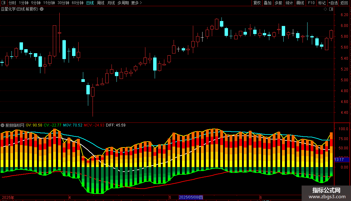 CV:EMA(100-GV,3)*(-1),LINETHICK2,COLORGREEN;