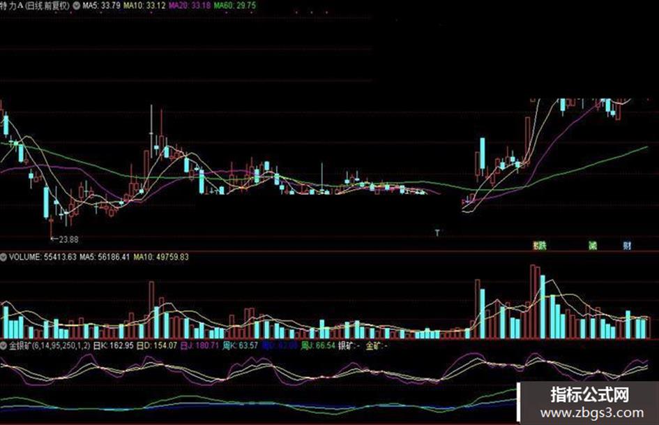 周J:IFF((3*周K-2*周D)>100,100,IFF((3*周K-2*周D)<0,0,(3*周K-2*周D))),COLORGREEN;