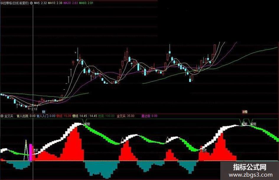 金叉买副图趋势找买点,出现“宽衣”或者金叉买信号买入,出现“解带”信号卖出。金叉买副图配合低位横盘主图使用是最佳组合