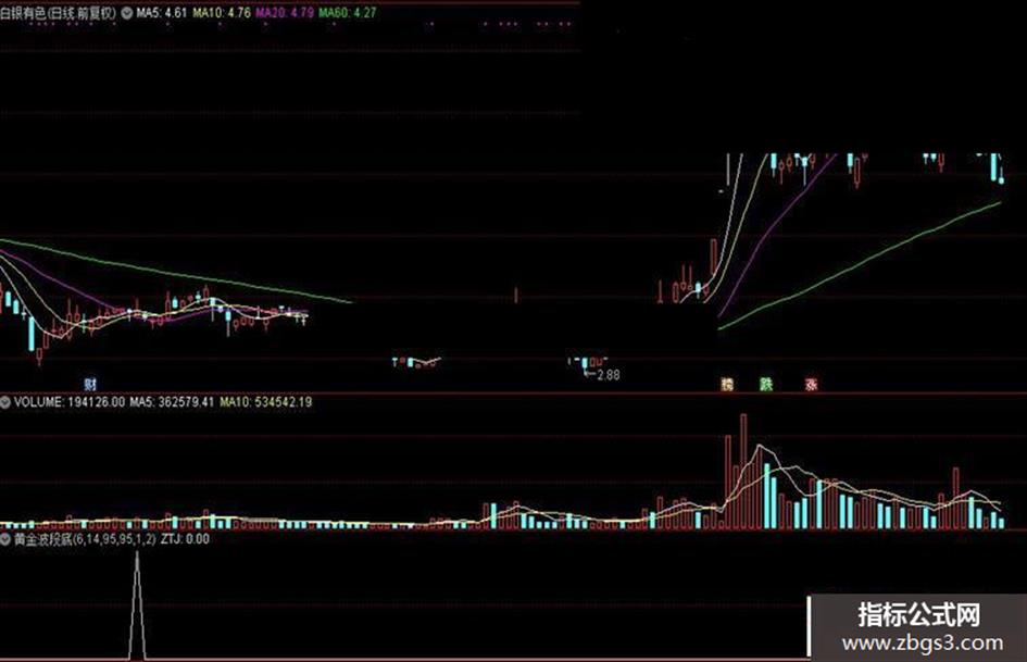 通达信指标黄金波段底选股 V1:=MA(V,40); KK:=MA(C,20); A1:=COUNT(V/V1<1.3,14)>11; A2:=EVERY(C>=KK,3); A3:=COUNT(V/V1>1.5,5)>=3; ZTJ:(A1 AND LONGCROSS(A2,0.5,30)) OR (A3 AND LONGCROSS(A2,0.5,30));