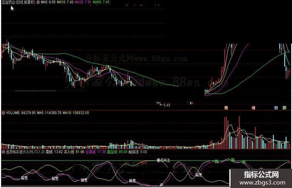 DRAWTEXT(买入线>76.5 AND CROSS(卖线,必卖线),必卖线*1.15,"进");