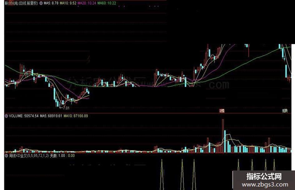 AF1:=MOD(CURRBARSCOUNT,5); M1:=IF(AF1=0,C,DRAWNULL),LINETHICK5; L1:=REF(M1,CURRBARSCOUNT*4); L2:=C; 天数:CURRBARSCOUNT,NODRAW; RSV1:=(L1-LLV(L1,9))/(HHV(L1,9)-LLV(L1,9))*100; K1:=SMA(RSV1,3,1); D1:=SMA(K1,3,1); CROSS(K1,D1);
