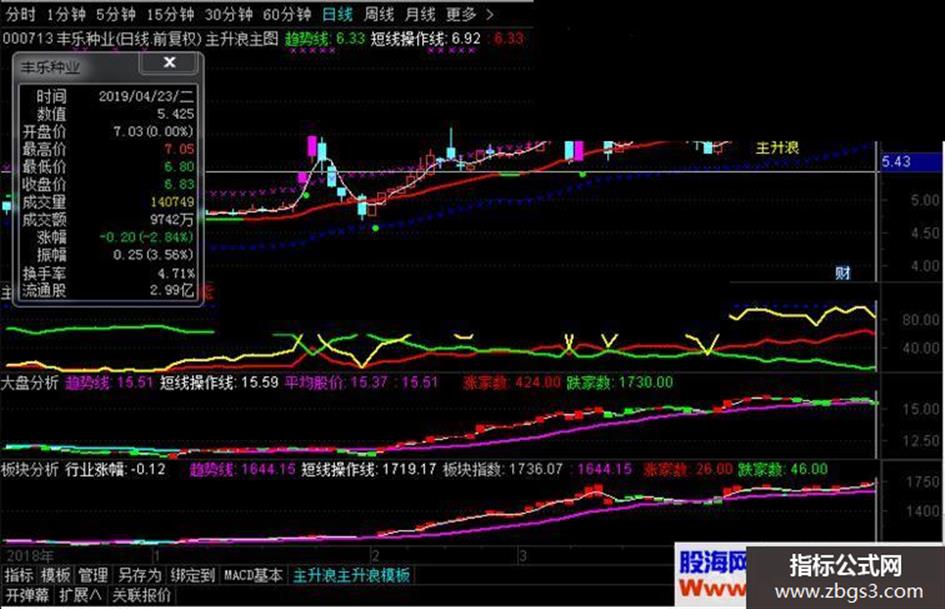 1.主升浪:代表主图趋势线由绿色变为红色后首次出现黄色点或红色点,选出个股应及时介入。