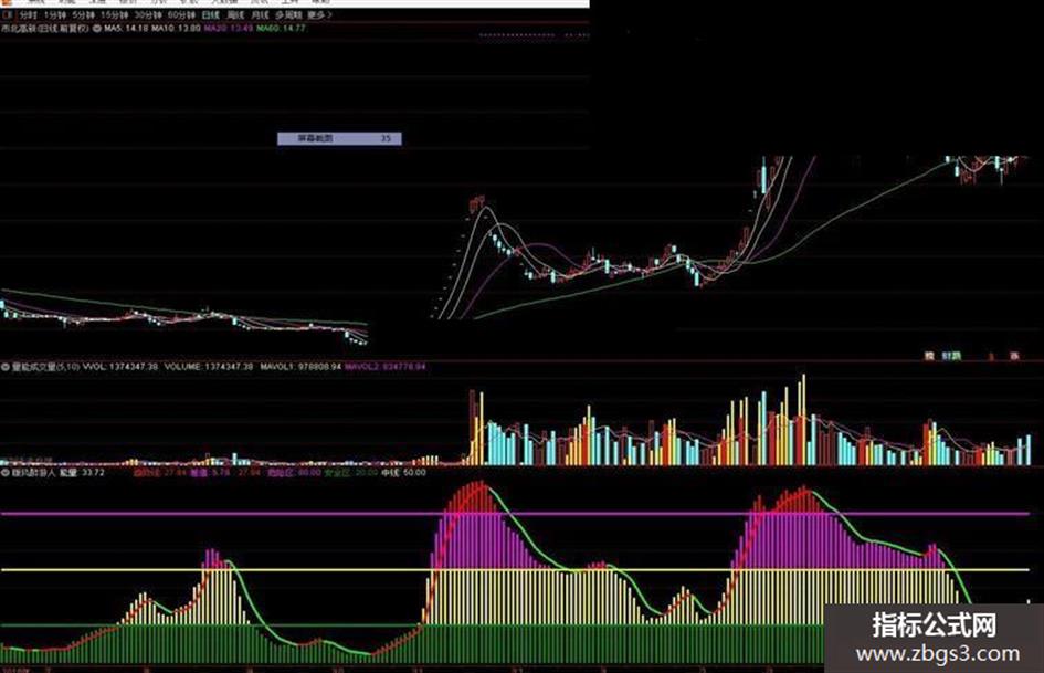 “山外青山楼外楼,西湖歌舞几时休?暖风熏得游人醉,直把杭州作汴州。” 前段时间“牛市来也”呼声一片,大盘指数拉了850点,在游资欢庆的日子里你赚钱了吗?别被牛市忽悠了!现送你个金娃娃,以后能不能赚大钱就看诸位造化了!常言道股市量在价先!由于各种原因引起股票量能不断积蓄而促使股价逐步上扬,直至最后飚升!随着高位高量换手,庄家全身而退,一波行情就此结束!因此量能大小变换的循环周期是每个操盘者非关注不可的!发一个自用的中线量能精品指标,用于精准波段抄底或逃顶,亦可用于股票处于强势或弱势区域的判断 !上次发的是加密版,好几个朋友求源码,现予以公开,愿更多人受益!此举如若动了谁的奶酪也请谅解!