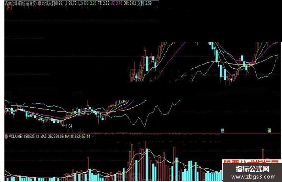 BS:(EMA(C,5)+EMA(C,6))/2,COLORGREEN; QRX:=(ref(BS,2)+ref(BS,3))/2; ft:EMA(c,11),COLORWHITE; Je:(EMA(c,22)+EMA(c,23))/2,COLORMAGENTA; DK:(EMA(c,67)+EMA(c,68))/2,COLORYELLOW; 交割:DK-(BS-QRX+(FT-JE)/2+(JE-DK)/3),COLORCYAN;