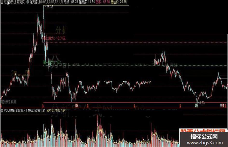 强支撑:DRAWLINE(CURRBARSCOUNT=CONST(VH)+1,REF(JJ,VH),ISLASTBAR,REF(JJ,VH),0),COLORWHITE;