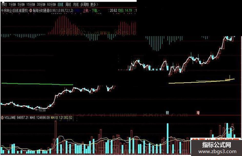 下轨:IF(NP>FP,IF(UTL<=RH,UTL,DRAWNULL),IF(UTL>=RL,UTL,DRAWNULL)),COLOR00EE00,LINETHICK1,DOTLINE;