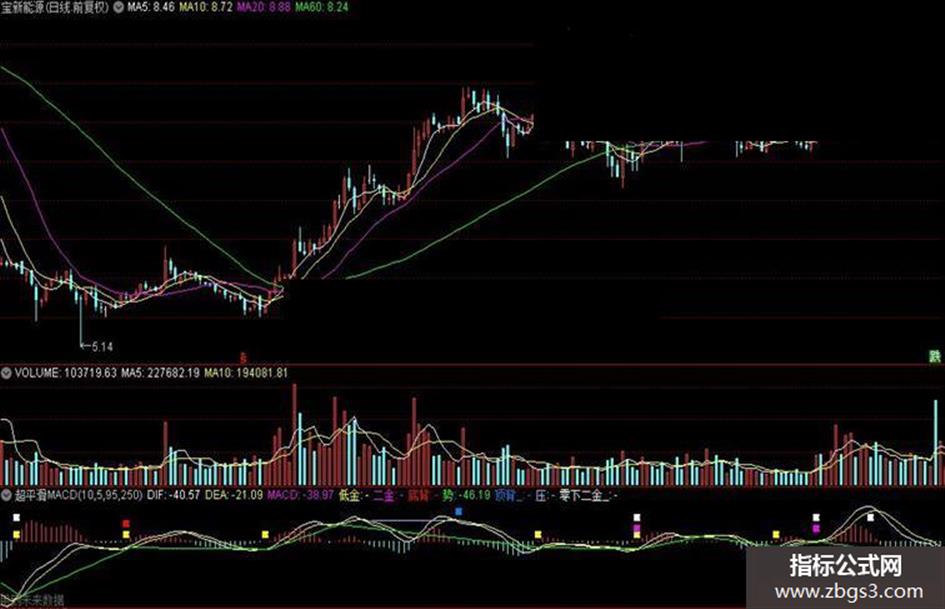 低金:IF(CROSS(DIF,DEA) AND DIF<-0.1,15,DRAWNULL),COLORYELLOW,LINETHICK4,CROSSDOT;