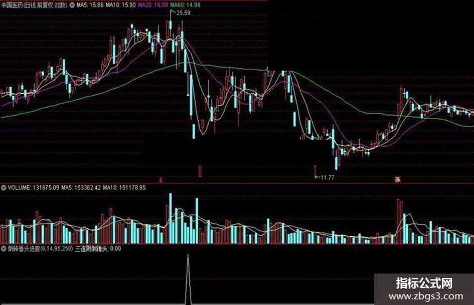 收阴:=CLOSE<OPEN; 大阴:=COUNT(O/C>1.02,3)>1; LY3:=COUNT(收阴,3)=3 AND 大阴; LY4:=COUNT(收阴,4)=4 AND 大阴; LY5:=COUNT(收阴,5)=5 AND 大阴; LY:=LY3 OR LY4 OR LY5; 三连阴倒锤头:H/MAX(C,O)>1.03 AND (H-MAX(C,O))/(H-L)>0.75 AND LY ;