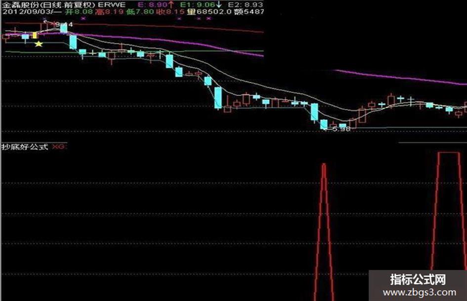 连跌5天:=DOWNNDAY(CLOSE,5); 四串阴:=EVERY(CLOSE<OPEN,4); F1:=IF(C>REF(C,1),100*VOL/CAPITAL,0); F2:=IF(C<REF(C,1),100*VOL/CAPITAL,0); XX:=-SUM(F2,5); YY:=SUM(F1,5); ZZ:=XX+YY; XG:(连跌5天 AND XX=ZZ) OR (四串阴 AND XX=ZZ),COLORRED,LINETHICK2;