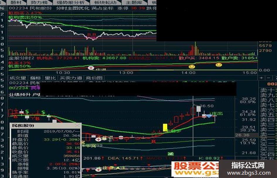 本分时为本人日常使用,B,S点买卖即可。现价在均线上方,均线显示为紫色;现价在均线下方,均线显示为绿色。高手即可根据B,S点和均线做T。主力买入占比超过50%,可大胆追买,涨停概率极大。
