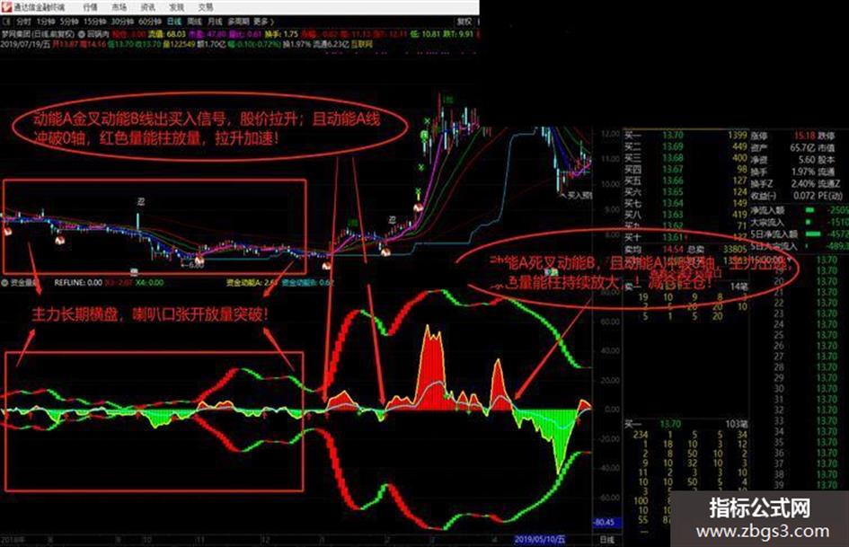 本指标使用很简单,多看几次图就明白。 建议选择股性好的标的。 喇叭口收窄且极度缩量的标的开始密切留意,合久必涨!一但的动能A金叉动能B线,标的异动反转;动能A冲上0轴且出现红色量能柱持续放大,股价开启一波拉升旅程。 反之,股价开始回调下跌。