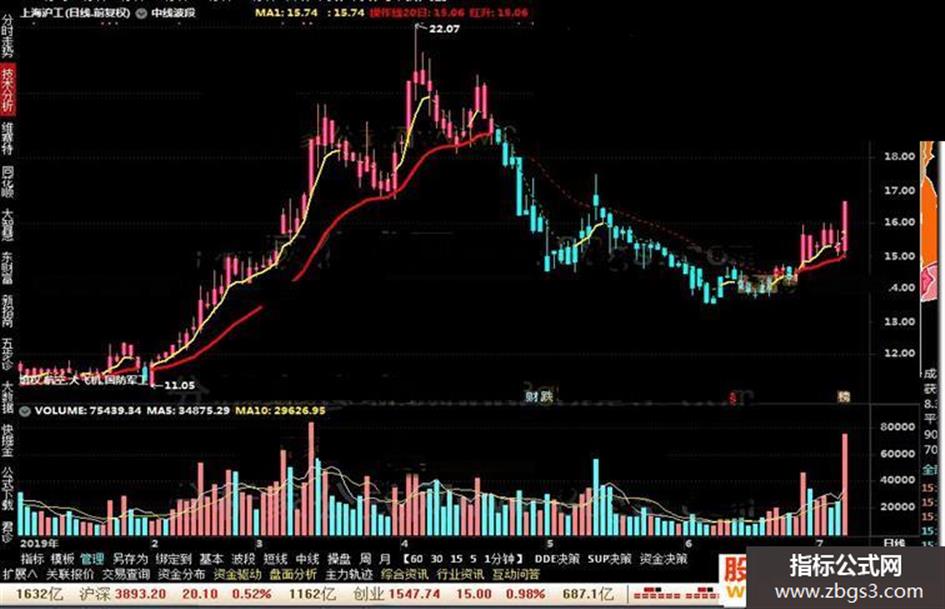 红升:IF(操作线20日>REF(操作线20日,1),操作线20日,DRAWNULL),COLOR0000FF,LINETHICK3;
