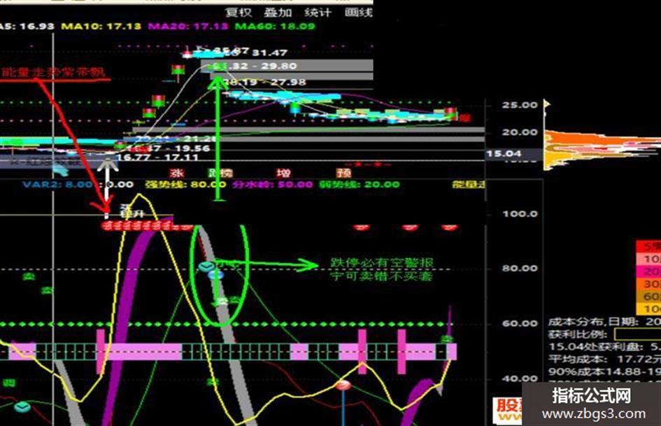 4.紫色带和灰色带在60线下上蹿下跳,股价横盘,不参与,非要等到黄色能量走势线和紫色飘带同时扶摇而上60日线,且“多”图标出现,方考虑介入。